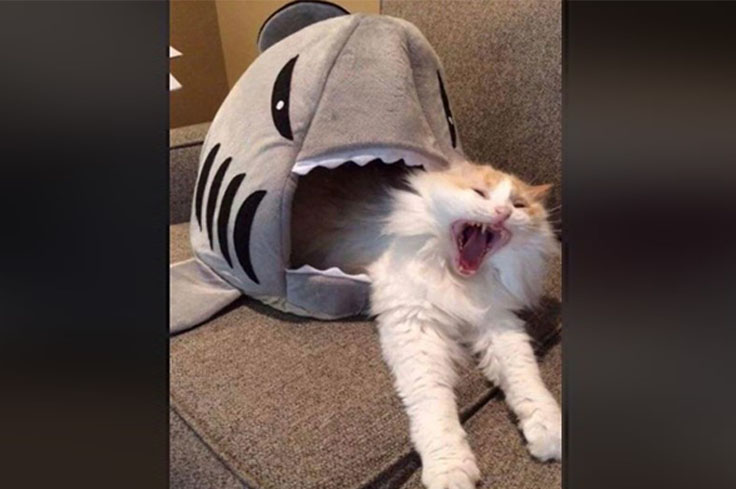 A cat appears to be caught in a shark attack, with its body half inside a shark-shaped toy. The cat’s wide-mouthed yawn or scream adds to the dramatic effect, creating a hilarious and exaggerated scene. This playful setup is a fun twist on the typical cat nap. The image cleverly uses the shark toy to create an amusing narrative.