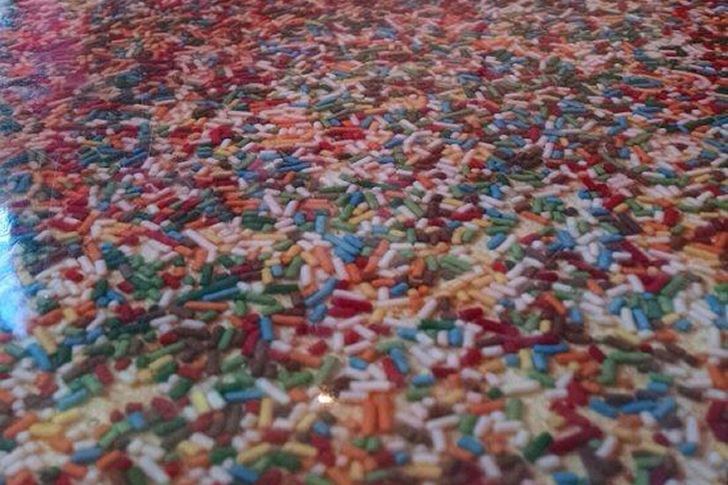 Indeed, you’re seeing a countertop crafted from an array of colorful sprinkles! It’s a design choice that’s quite out of the ordinary, and there’s likely a rare justification behind such a novel approach. Nonetheless, its distinctiveness is undeniable.