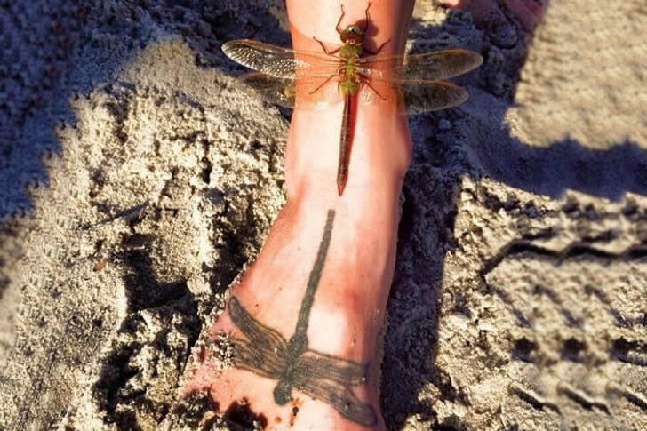 A dragonfly miraculously landed on someone’s foot, right next to a tattoo that strikingly resembled the insect itself. This curious incident was fortuitously captured in a photograph. It’s intriguing to speculate whether the dragonfly mistook the tattoo for a fellow dragonfly. Regardless, the alignment of the insect with the tattoo made for a unique and cool snapshot.
