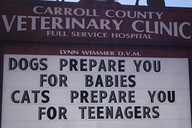 If you want to increase foot traffic to your veterinary clinic, consider this clever sign. It states that dogs prepare people for babies, while cats ready parents for teenagers. Dogs are wonderful, resembling large, clumsy infants, which is part of their charm. Cats, however, are another matter entirely. They can be moody and antisocial, much like typical teenagers.